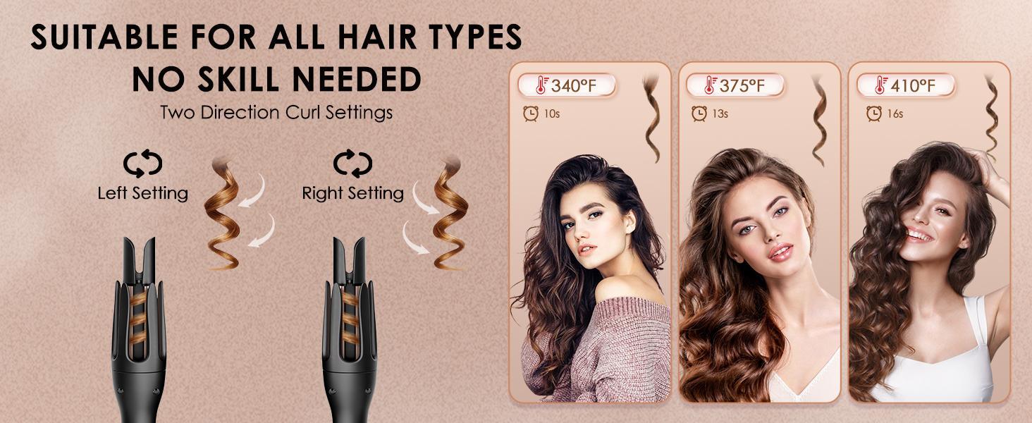 • „ÄêFast heating & 3 temperature adjustments, suitable for fine/medium/coarse hair„Äë auto curling iron has three adjustable temperatures, 340‚Ñâ/375‚Ñâ/410‚Ñâ. You can choose the corresponding temperature according to your hair quality needs. heats up quickly, so you don`t have to wait too long to complete beautiful curls on busy mornings!